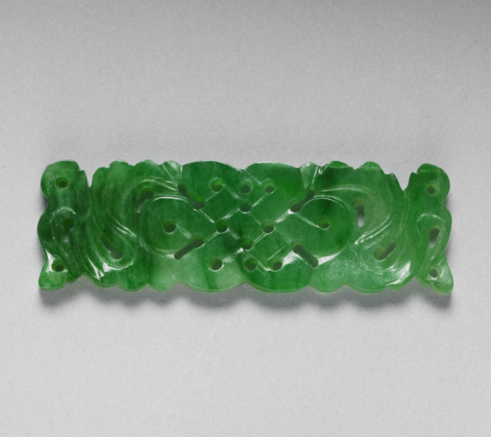 香包玉腰果形,腹镂雕双龙,中为团寿,两面纹式相同,颈及盖均平行弦纹,黄色系绳两端各编盘长结一,并缠蓝、白丝线。镂空玉雕香包, 腹部呈腰果形, 雕团寿对螭纹, 缠枝叶纹布地。盖与颈雕折叠束口平行纹, 形如织绣荷包, 穿系盘长结绳带。清宫档案记录显示,精工制作 的荷包、香囊常是帝王赏赐皇室成员或功勋臣属之物。